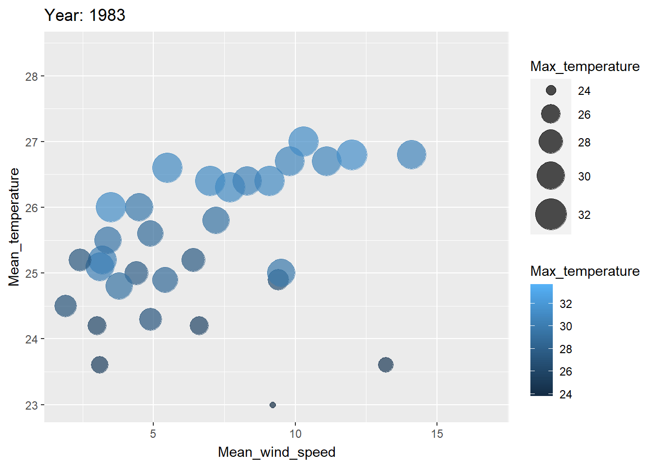 ggplot(combined_df, aes(x = Mean_wind_speed, y = Mean_temperature, size = Max_temperature, color =Max_temperature )) +