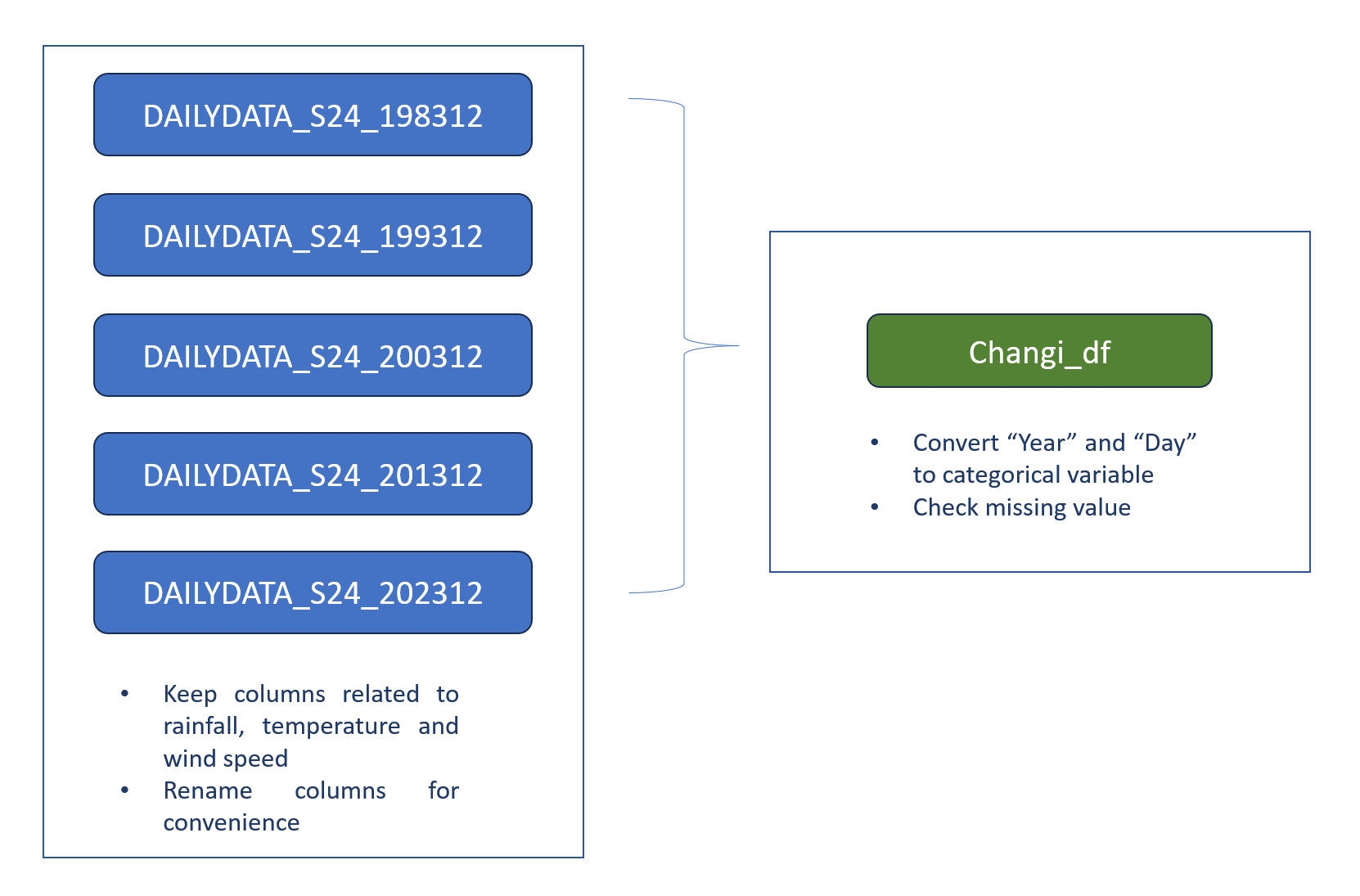 colnames(changi_2023) <- c("Station", "Year", "Month", "Day", "Daily_rainfall_total","Mean_temperature", "Max_temperature", "Min_temperature", "Mean_wind_speed", "Max_wind_speed")2.4 Combine data